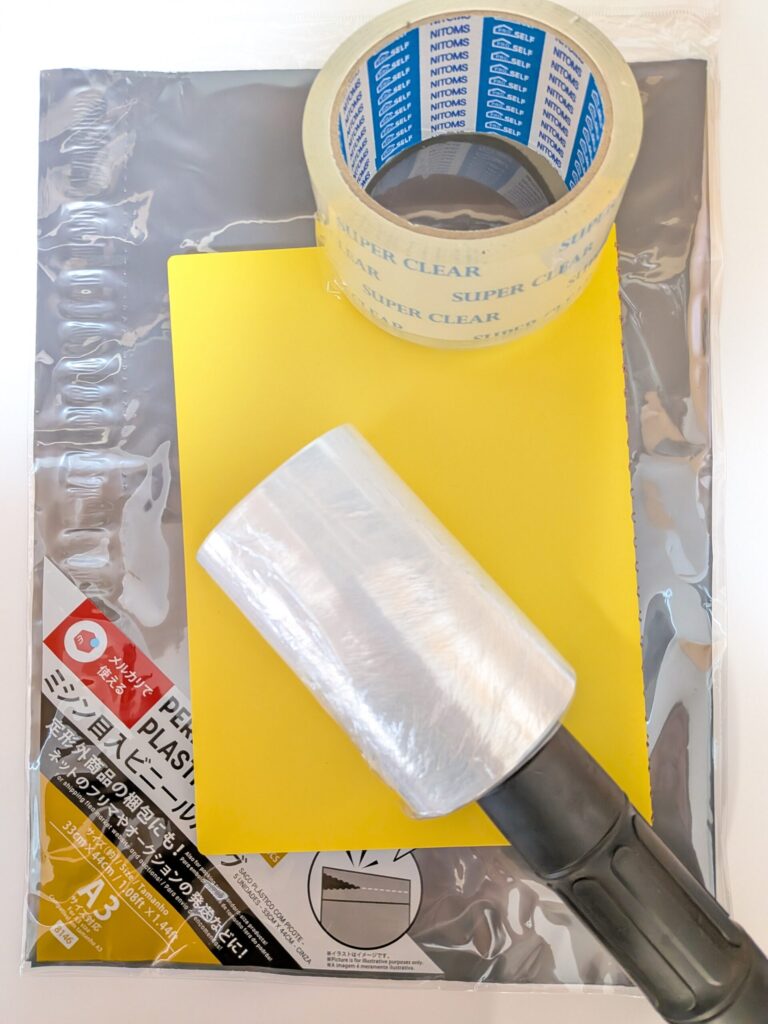 ⇒ ホームセンターで買えるストレッチフィルムで本をぐるぐる巻きにして保護し、ビニールバッグに入れる→最後に余った部分を透明テープで張り付ける。